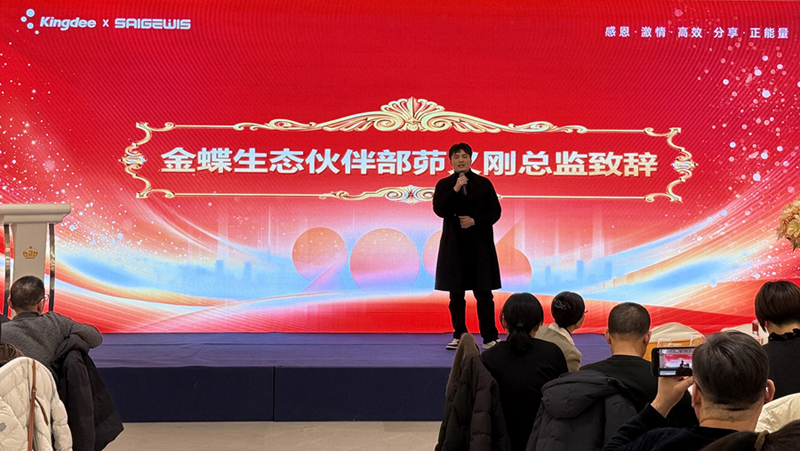晚会在金蝶生态伙伴部总监茆义刚先生的热情致辞中拉开序幕。茆总高度肯定了赛格科技作为金蝶核心战略合作伙伴的卓越贡献与深厚情谊,并深入阐述了在数字经济浪潮下,金蝶AI,让管理成就新价值,金蝶将深化生态协同的广阔前景。他的话语如春风化雨,为赛格科技在更广阔的产业生态中开疆拓土注入了强劲信心与澎湃动力。
